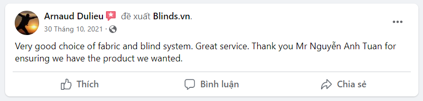 ” Very good choice of fabric and blind system. Great service. Thank you Mr Nguyễn Anh Tuan for ensuring we have the product we wanted. ” – Mr. Arnaud De Lendroit.