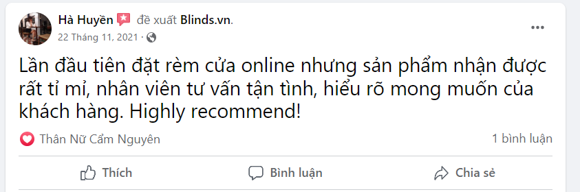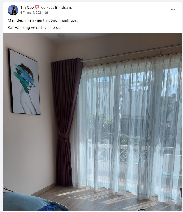 “Lần đầu tiên đặt rèm cửa online nhưng sản phẩm nhận được rất tỉ mỉ, nhân viên tư vấn tận tình, hiểu rõ mong muốn của khách hàng. Highly recommend!”- chị Hà Huyền.