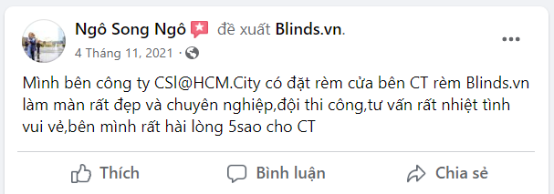 “Mình bên công ty CSI@HCM.City có đặt rèm cửa bên CT rèm Videcor.vn, làm rèm rất đẹp và chuyên nghiệp, đội thi công, tư vấn rất nhiệt tình, vui vẻ, bên mình rất hài lòng 5sao cho CT” – anh Ngô Song Ngô
