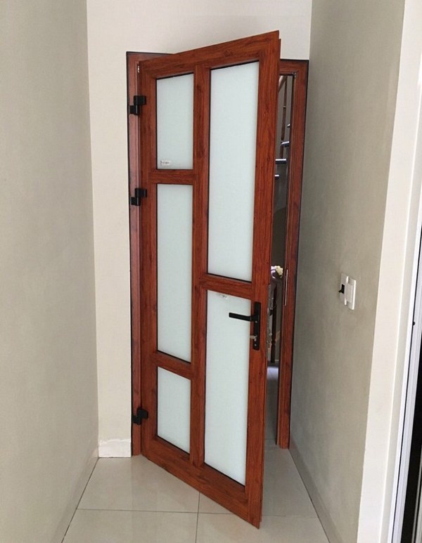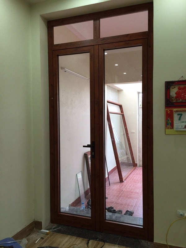 4. Mẫu cửa đi thông phòng xingfa vân gỗ kết hợp kính trắng mờ